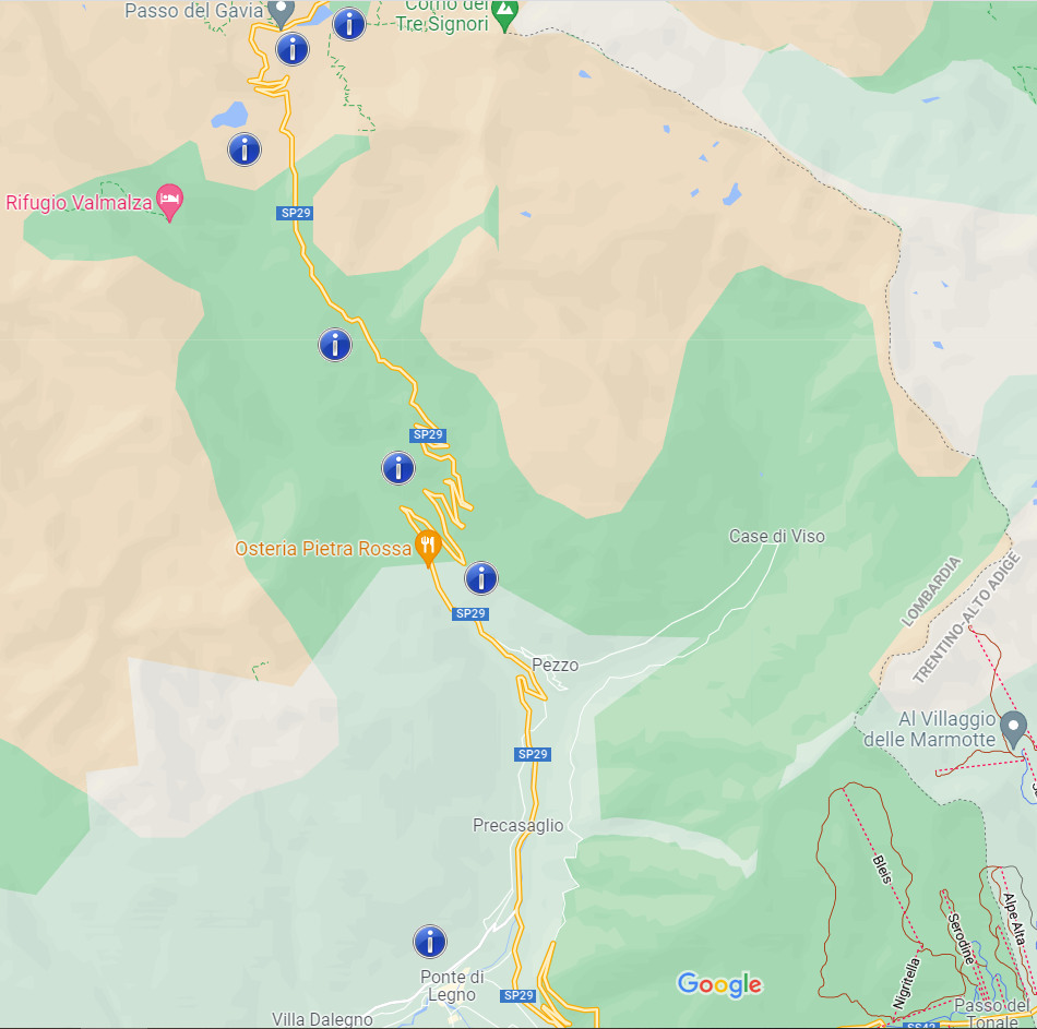 |  | | Titolo | Passo Gavia | | Testo | | | Link | | | Allegato | | | Altimetria | da 2450 metri a 2650 metri | | Distanza | 2190 metri in linea d'aria, 2190 metri percorsi |