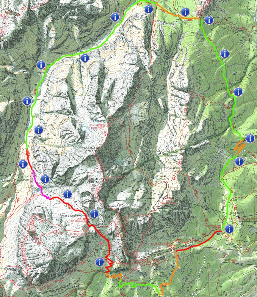 | Titolo | La Tofana di Rozes | | Testo | Ora è visibile tutta la vallata fino al Lagazuoi. Sulla sinistra è visibile il massiccio della tofana di Rozes con i suoi 3200 metri. | | Link | | | Allegato | | | Altimetria | da 1870 metri a 1900 metri | | Distanza | 800 metri in linea d'aria, 850 metri percorsi |