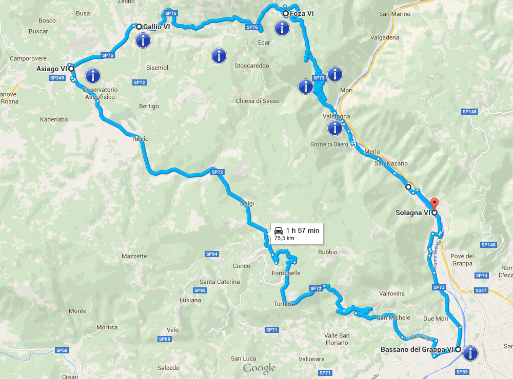 | Titolo | Valstagna | | Testo | Arrivando da Solagna prestate attenzione al cartello che trovate sulla sinistra che indica Foza. | | Link | | | Allegato | | | Altimetria | da 120 metri a 150 metri | | Distanza | 8000 metri in linea d'aria, 8000 metri percorsi |